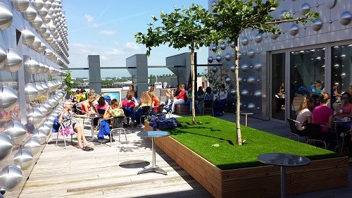 Vanuit het Kunstcafé loop je het dakterras van het Eemhuis op. Hier wordt de kleine stadsoase voortgezet in de aankleding. Een plek om - bij mooi weer - lekker in de zon te zitten, te lunchen of even op adem te komen. Vanaf het dakterras kijk je uit op het Eemplein.